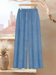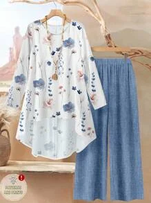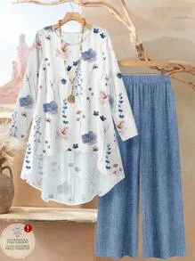 usticease 2pcs/Set Women Watercolor Floral Print Loose Fit Round Neck Long Sleeve Top And Pants Suit,